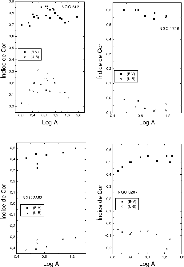na Tabela A.1). Os índices de cor em magnitudes estão expressos em função do logaritmo da abertura do