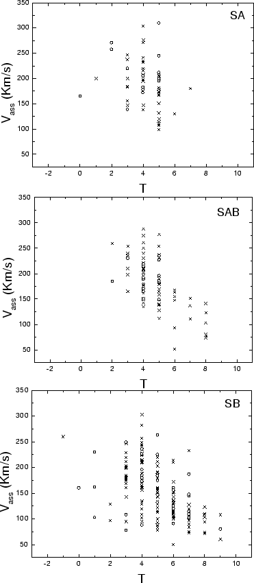 Outro ponto interessante a se notar é o de que o desvio padrão para as 99 galáxias com excelente determinação da velocidade assimptótica é muito semelhante àquele que se refere ao restante da amostra. Isso indica que este espalhamento é uma característica intrínseca. A Tab. 1.1 mostra este resultado comparando os desvios padrão para ambas as amostras separadamente, identificando ainda a morfologia referente à barra. Nota-se também que galáxias ordinárias, levemente ou fortemente barradas apresentam velocidades e desvios padrão similares. O fato de as galáxias fortemente barradas apresentarem uma velocidade assimptótica média reduzida (ver Tab. 1.1) se deve, principalmente, à ausência de galáxias ordinárias ou levemente barradas entre os tipos tardios (ver Fig. 1.6).
